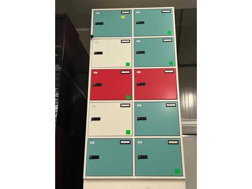 Kast volledig in metaal kleur wit, uitgerust met 10 deuren kleur roodn blauw en wit, elke deur uitgerust met een codeslot voor persoonlijke veiligheid en een persoonlijk nummer, alle sloten zijn ge-reset op 3333, gebruiksaanwijzing aanwezig, afm. 1950 x 900 x 500 mm (h x b x d), afmetingen lockers 450 x 350 x 500 mm (b x h x d) , in zeer goede staat.
