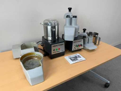 Professionele foodprocessor / groentesnijder van Robot Coupe, model R301 Ultra. Set bestaande uit twee motorblokken met bijhorende opzetstukken en accessoires. Geschikt voor intensief gebruik in horeca, catering, grootkeuken of traiteur.