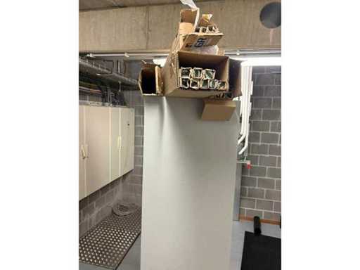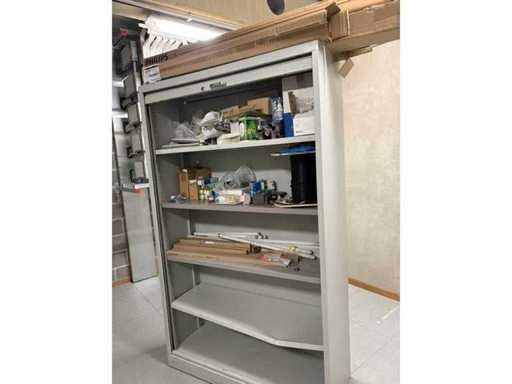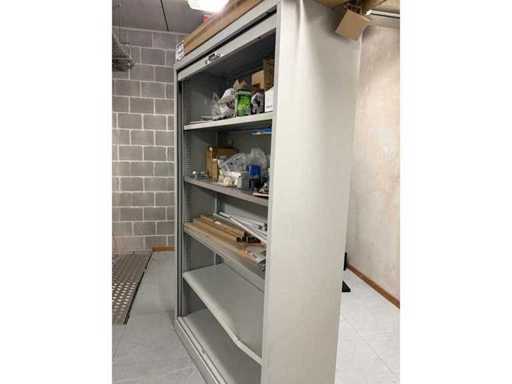 Hoge Horizontale roldeurkast – Grijs (Metaal) horizontale roldeurkastkast in grijs metaal, voorzien van vier leggers. Praktische opbergoplossing voor kantoor-, archief- of projectruimtes. Met gebruikssporen, exacte staat kan variëren bij afhaling. (INHOUD NIET INBEGREPEN)