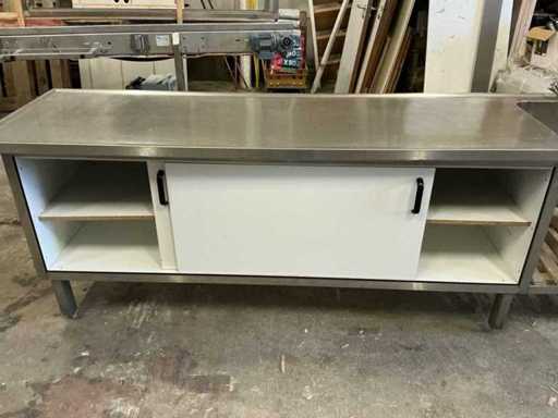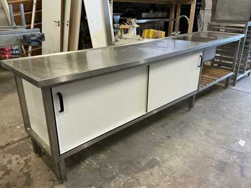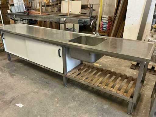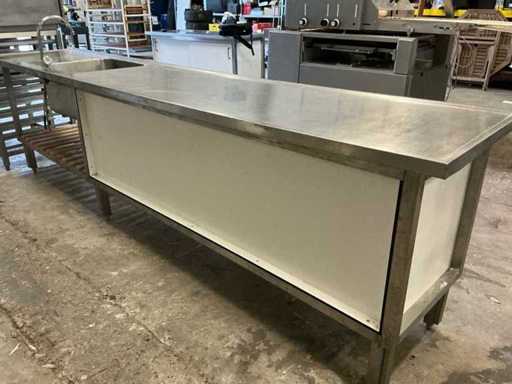 Voorzien van: speolbak met kraan, houten rek, opberggedeelte met schuifdeuren. Opberggedeelte :190 x 50 x 50 cm. Breedte grote werkblad (exclusief spoelbak): 190 cm.