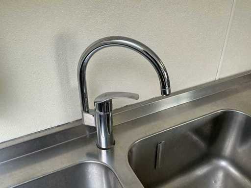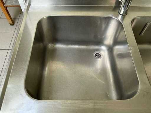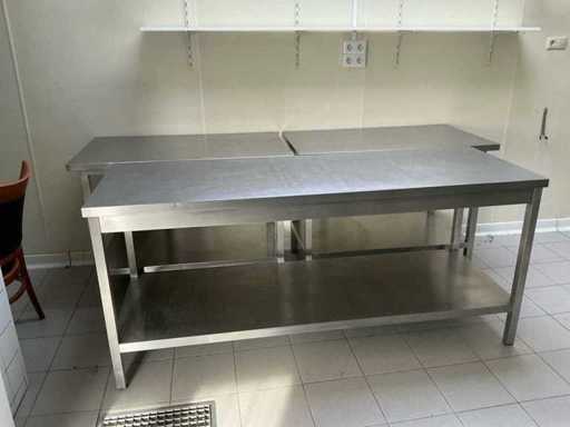 Bestaat uit: 2 stuks RVS werktafel 1200mmx700mmx 900mm hoog. 1 stuks RVS werktafel 2000mmx700mm, 900mm hoog, 2 stuks RVS spoelbakken 1750mmx700mmx900mm hoog. Kraan met 2 wasbakken, (totaal 3 losse RVS werktafels, 1 maar RVS werktafel met spoelbakken, deze kavel bestaat uit 3 roestvrijstalen werktafels en een dubbele RVS spoelbak, geschikt voor professioneel gebruik in horecakeukens, grootkeukens, bakkerijen of andere voedselverwerkende omgeving, voorzien van achteropstand (spatwand) bij de spoelunit, open onderruimte geschikt voor opslag, degelijke, stabiele constructie, hygiënisch en eenvoudig te reinigen, de spoelbak is voorzien van twee ruime bakken en zichtbare afvoerinstallatie, de werktafel beschikt over een extra legschap voor opslag van materialen of apparatuur.
