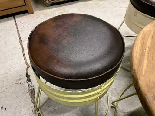 Bestaande uit salontafel met metalen onderstel dia 60, hoogte 41cm en teakhouten bovenblad, 3 zitjes voorzien van kunstlederen bekleding dia 30, hoogte 42cm