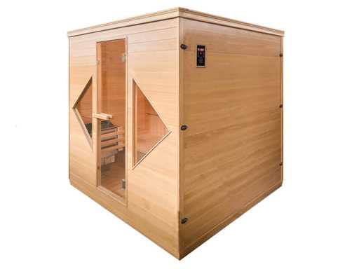 Type: SMS-601. Model: Sauna met kachel - rechthoekig. Afmeting: 2060x1830x2040mm. Verwarming: Kachel (6 KW). Voorzien van: Helder veiligheidsglas 8 mm - Ventilatie - Control Panel - Ca. 15 Kg. Lavastenen - Houten deurhendel - Bluetooth integratie voor muziek met speaker - Incl. vloer - Houten emmer met scheplepel - Zandloper - Thermometer