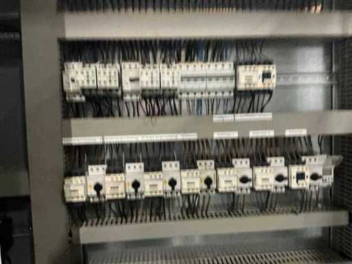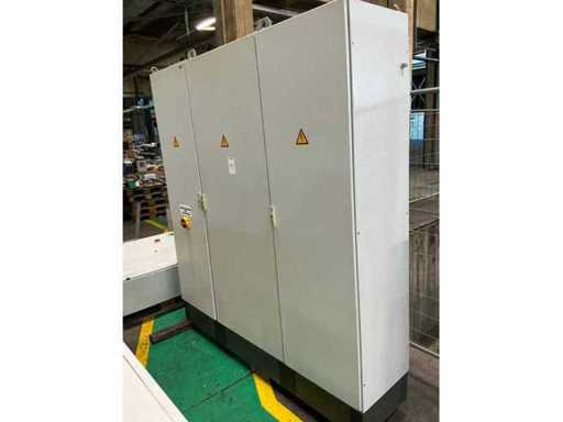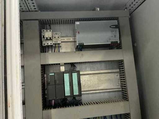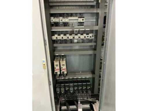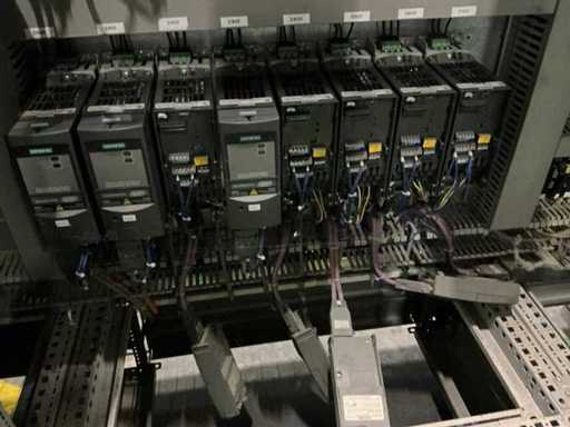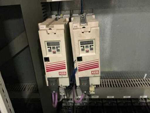 inhoud bestaande uit Siemens PLC, relais, 2x KEB frequentieregelaar, 8x Siemens Micromaster frequentieregelaar , zekeringsautomaten, contactors,,….