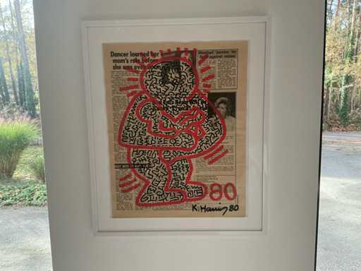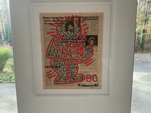 Vilten pentekening op krantenpapier. Toegeschreven aan Keith Haring door Julia Gruen (uitvoerend directeur van de Keith Haring Foundation, gestempeld en getekend op de achterzijde). Afmetingen 30x37cm. Voorzien van een professionele lijst met UV-werend glas. Gedateerd 1980.