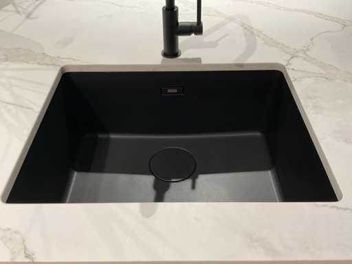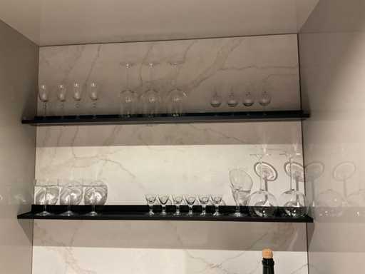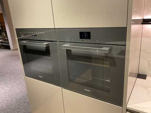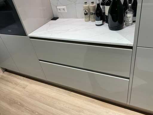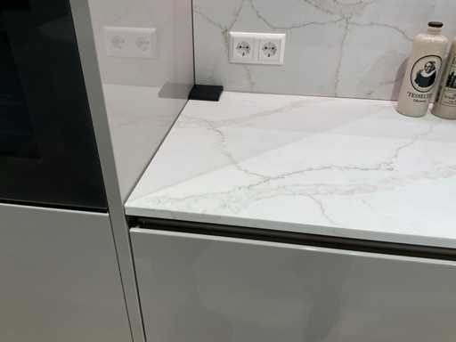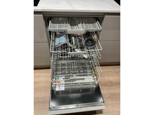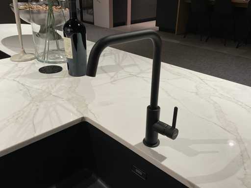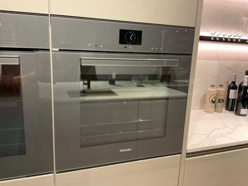 Kook-spoeleiland indeling: 7 onderkasten waarvan 4 met kwartrond front; 2 ladenkasten waarvan 1 met binnenlade en een afvalscheidingssysteem; zitdeel; Miele 4-zone inbouw inductie kookplaat met afzuiging; type KMDA7876FLUMASWl Miele inbouw vaatwasser; type G5455SCVIXX met besteklade; 14 couverts; Twist inbouw contactdoos; indeling kastenwand met coffeecorner: coffeecorner met composiet werkblad en achterwand; 1 ladenkast met binnenlade en vakverdeling; 2 wandplanken matzwart met lichtlijn onder en boven; afm. 119x12 cm; wandschakelaar; 5 hoge kasten waarvan 1 met 5 binnenladen; Miele inbouw combi stoomoven; type DGC7665 HC Pro; inhoud 67 liter; met vaste wateraansluiting; Miele inbouw combi stoomoven; type DGC 7250; inhoud 76 liter; Miele inbouw koelvriescombinatie; type KFN7833 D; inhoud 215/70 liter; Scan de QR code voor meer informatie; LET OP: door koper zelf ter plaatse nog te demonteren; zonder de getoonde accessoires