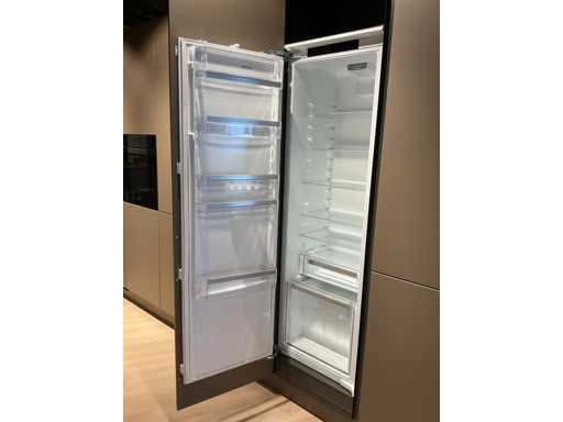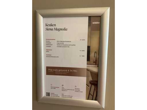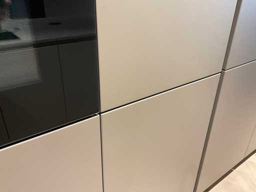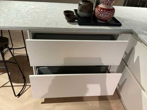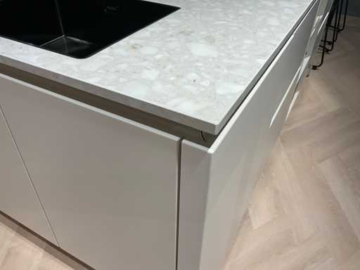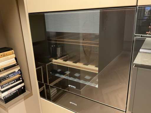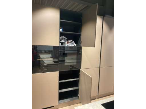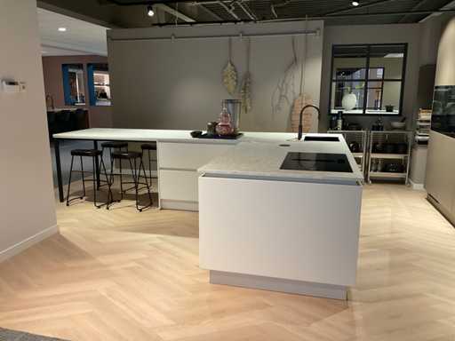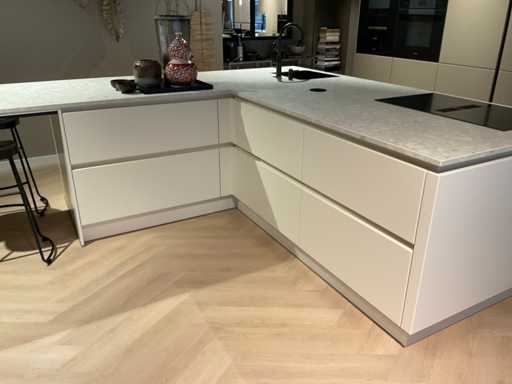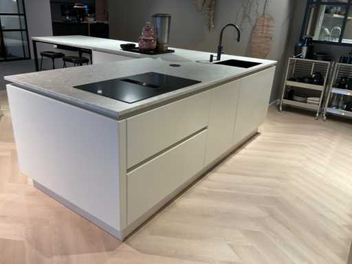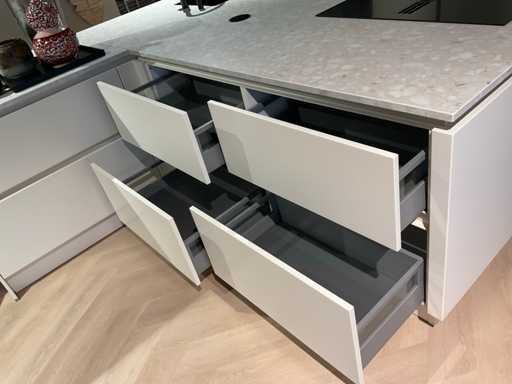 Kook-spoeleiland met tafel; indeling: 1 onderkast; 6 ladenkasten; waarvan 1 met binnenlade; 2 x bestekinzet; 3 open vakken; tafeldeel lengte 150 cm; Smeg 4-zone inbouw inductiekookplaat met geïntegreerde afzuiging; type HOBD382MB2; Bosch inbouw vaatwasser; type SBV4ECX23E; 13 couverts; Twist inbouw stopcontact; indeling kastenwand: 6 hoge kasten; waarvan 1 met 5 binnenladen en 1 met uittrekplateau en 3-voudige wandcontactdoos; Smeg inbouw oven met magnetron; type SO6102M2B3; inhoud 68 liter; Smeg inbouw wijnklimaatkast; type CVI29B3; inhoud 29 flessen; Smeg sommelierslade; type CPS 115B3; Smeg inbouwkoelkast type S8L174DNE; inhoud 310 liter; Smeg inbouwvriezer; type S8F174DNE; inhoud 204 liter; Scan de QR code voor meer informatie; LET OP: door koper zelf ter plaatse nog te demonteren; zonder de getoonde accessoires