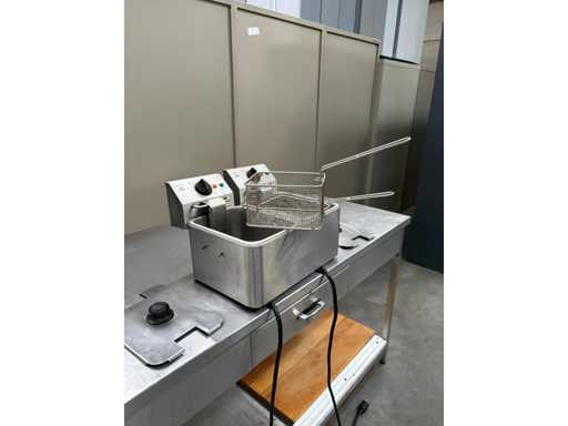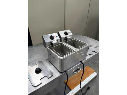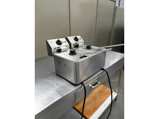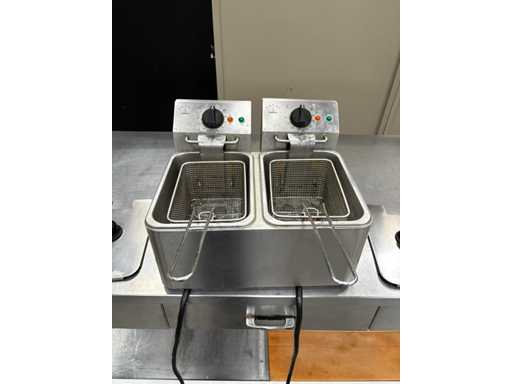 Professionele dubbele elektrische friteuse van het merk Select Horeca, uitgevoerd in roestvrij staal. Voorzien van twee afzonderlijke frituurbakken, elk met eigen thermostaat, controlelampjes en frituurmand. Geschikt voor intensief horeca-gebruik.