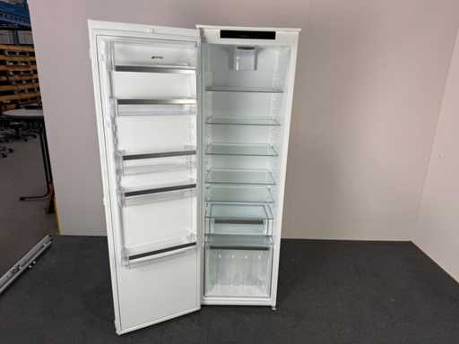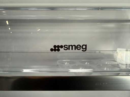 Inbouwkoelkast van het merk SMEG, uitgevoerd in wit. Toestel is voorzien van een koelgedeelte met meerdere glazen legplanken en deurvakken. Geschikt voor plaatsing in een keukenkast (inbouwtoepassing).