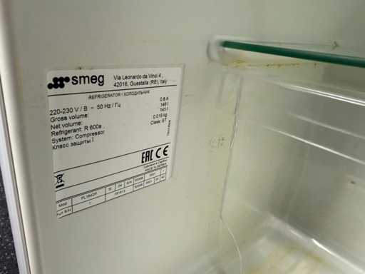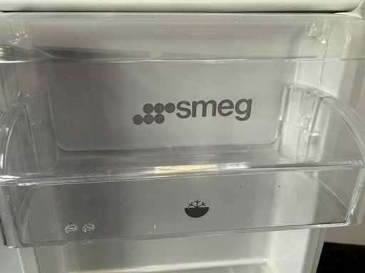 Compacte koelkast van het merk SMEG, uitgevoerd in wit. Geschikt als tafelmodel of voor plaatsing onder werkblad. Voorzien van glazen legplanken, groentelade en meerdere deurvakken. Ideaal voor kantoor, kitchenette, atelier of bijkeuken.