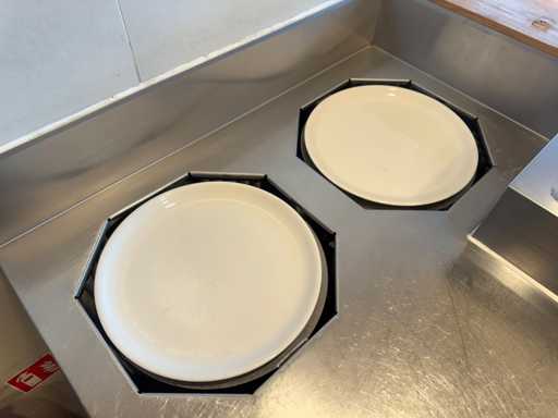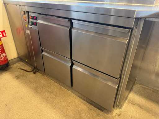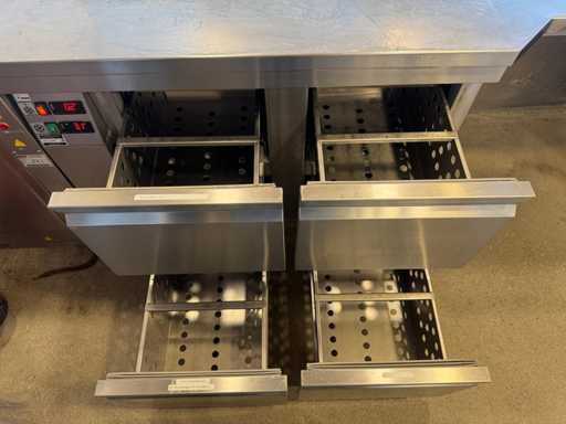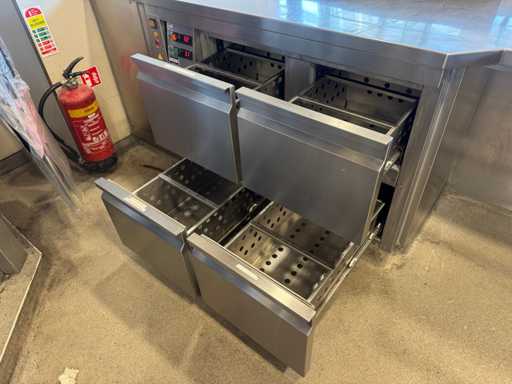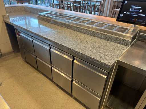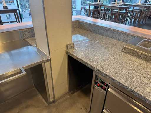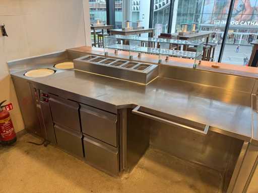 Hoekopstelling van pizza-werkbank en koelwerkbank met bordenwarmer. Inclusief ombouw.