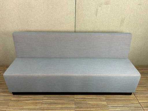 Tweezits grijze treinbank, medium staat. Solide zitbank voor wachtruimte, hal of kantoor. Tweedehands maar direct inzetbaar — ideale budgetoplossing.