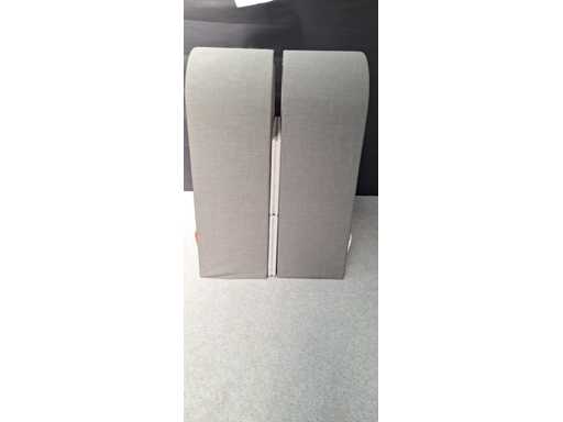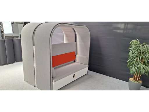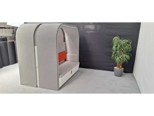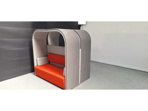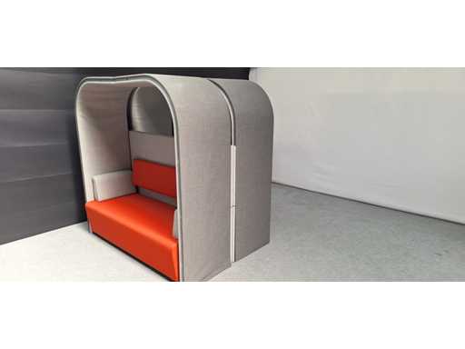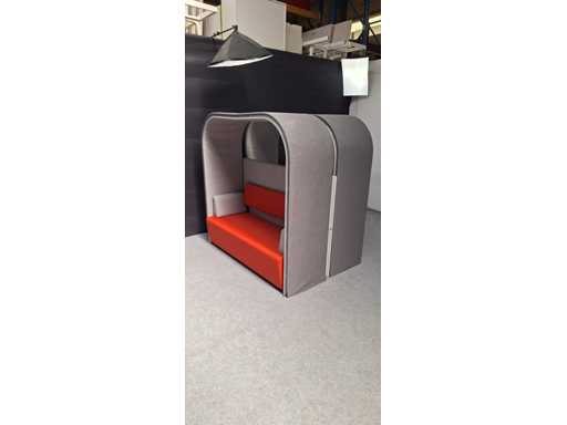 Tweezijdige dubbelle akoestische loungezetel / softseating, 4 tot 6 persoons, bekleding in stof kleur Grijs, voorzien van elektrificatie, gebruikssporen aanwezig