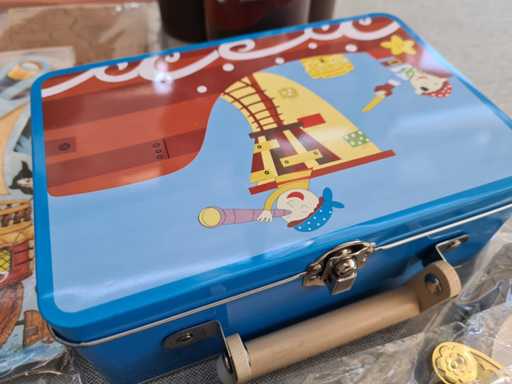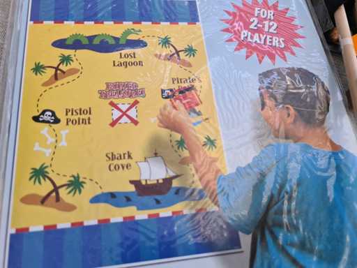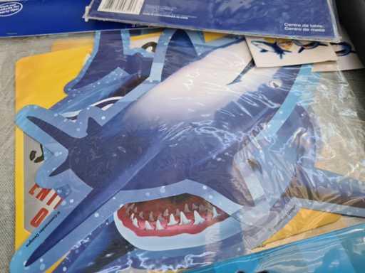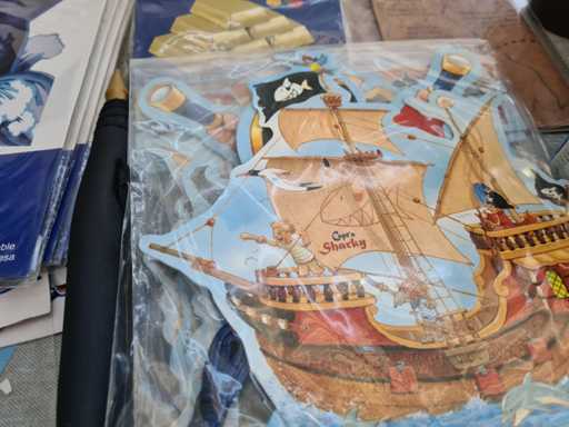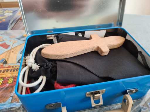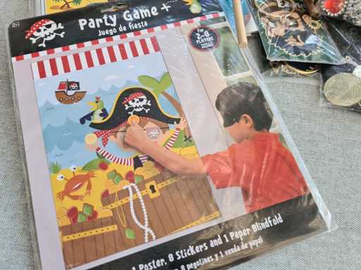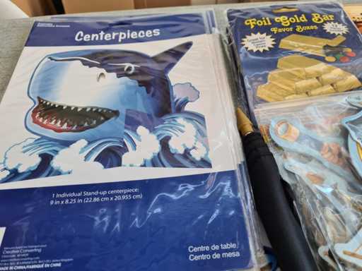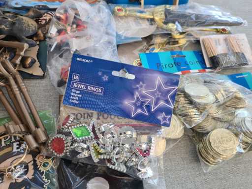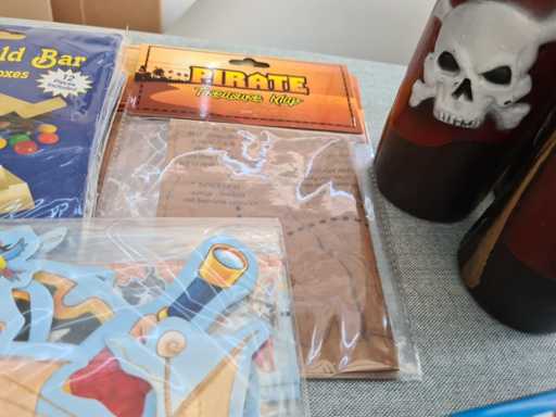 4 x party game 2 x haai cut out decoratie 4 x centerpiece haai decoratie 2 x 12 papieren goudstaven 3 x schatkaart 3 x plastic fles 2 x slinger 2 x sleutelset 2 x oorring 1 x ringenset 1 x prikkers voor hapjes 1 x vlag 1 x koffertje met volledige set piraat 1 x set zakje met goudmunten 3 x zakje goeden munten 1 x set piraten figuurtjes 3 x dolk