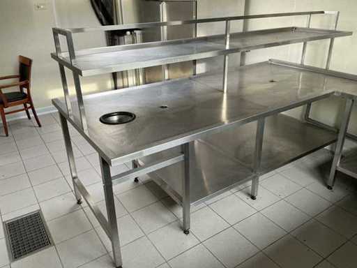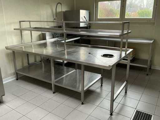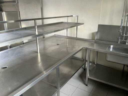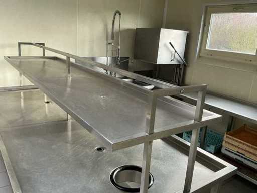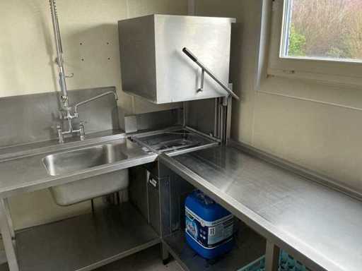 Voorzien van: RVS spoelkeukenopstelling bestaande uit een centrale werk-/spoeltafel met bovenopbouw, een RVS wandwerktafel en een professionele voorspoeldouche, Hobart doorschuif Vaatwasser (kapmodel) RVS (roestvrij staal), geschikt voor 500 x 500 mm korven, aansluitspanning: 400 Volt, vermogen: 8.25 kW, wateraansluiting, wastemperatuur: ca. 60 – 65 °C, naspoeltemperatuur: ca. 80 – 85 °C, capaciteit: ± 40 – 60 korven per uur, automatische doseerpomp voor reinigingsmiddel, centrale tafel is uitgevoerd in roestvast staal en voorzien van een onderblad en een dubbele opbouw (etagère), werkblad beschikt over een geïntegreerde afvoeropening. De constructie is volledig uitgevoerd in RVS met verstelbare stelpoten, de wandtafel is eveneens uitgevoerd in RVS en voorzien van een onderblad voor extra opslagcapaciteit, inclusief professionele voorspoeldouche met veermechanisme, geschikt voor horecatoepassingen, geschikt voor gebruik in horeca, grootkeuken, catering of productieomgeving, lengte dubbele tafel 2600mm, 1200mm, hoogte werkblad 900mm, hoogte afzetrek 1500mm hoog, breedte 660mm, spoeltafel 2200mm lang, breedte 640mm, hoogte 900mm, spoelbak 1650mm, breedte 750mm, hoogte 900mm,