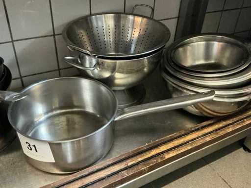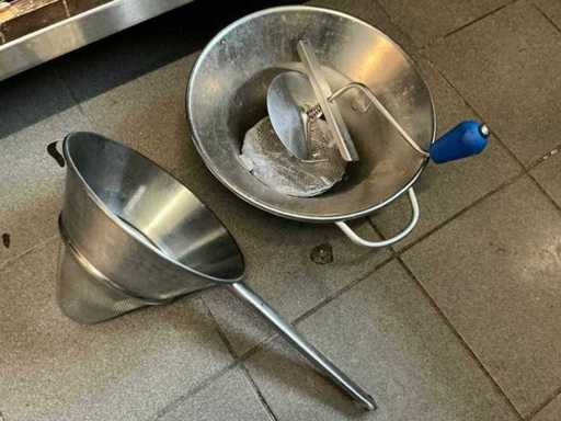 Compleet met 9 diverse rvs mengkommen, 2 vergieten, 1 passe-vite en 1 chinois a sauce