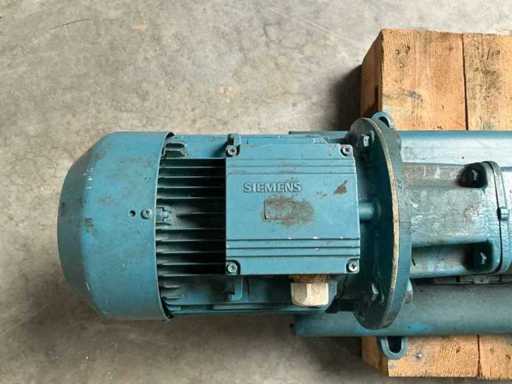 De pomp is gemonteerd op een stalen frame en vormt samen met de elektromotor één compacte en robuuste eenheid. Op het typeplaatje staat duidelijk vermeld dat de pomp niet droog mag draaien. De Siemens motor staat bekend om zijn betrouwbaarheid en degelijke industriële kwaliteit.