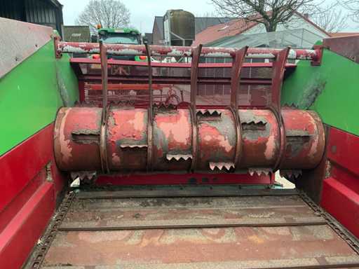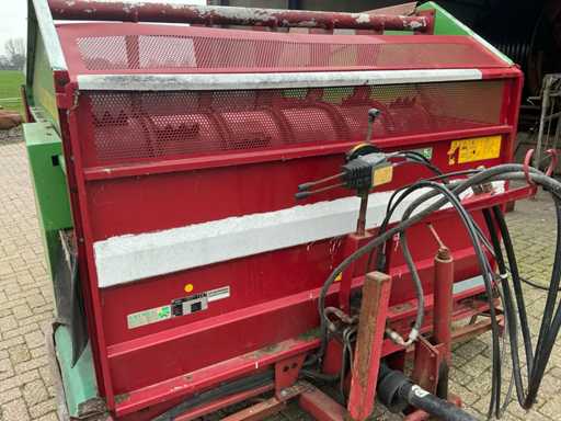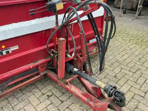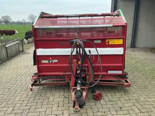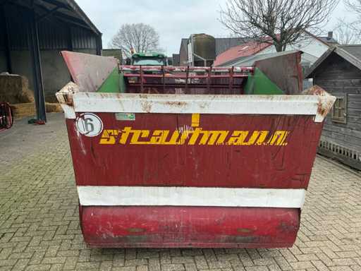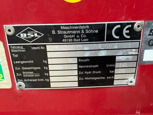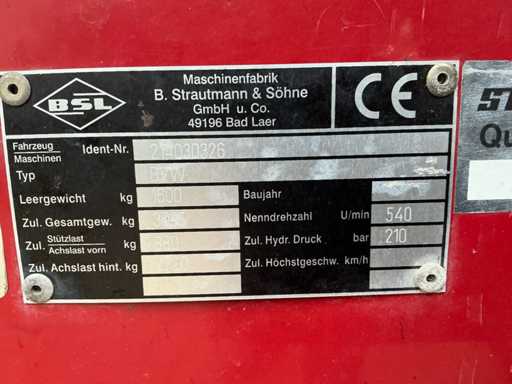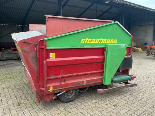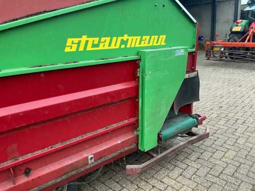 Voorzien van: Strautmann BVV getrokken voer-/strooimengwagen (bouwjaar ca. 1998–2003) met PTO 540 t/min, hydraulische aandrijving tot 210 bar, transportbandbodem met doseerrol, leeggewicht 1.600 kg, toegestaan totaalgewicht 3.600 kg, aslast achter 2.720 kg en steunlast 880 kg, CE-gekeurd.