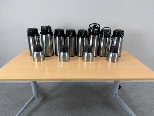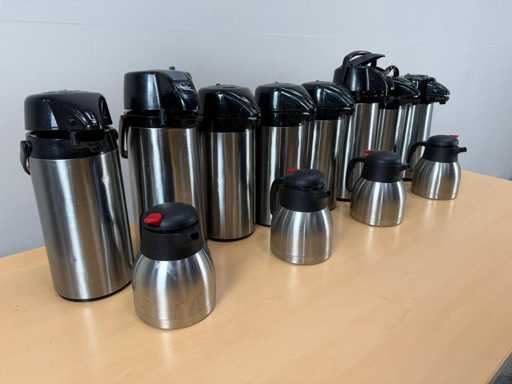 Partij roestvrijstalen thermosflessen en isoleerkannen, geschikt voor het warm of koud houden van dranken zoals koffie en thee. Ideaal voor horeca, catering, vergaderzalen, evenementen of bedrijfskeukens.