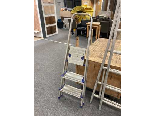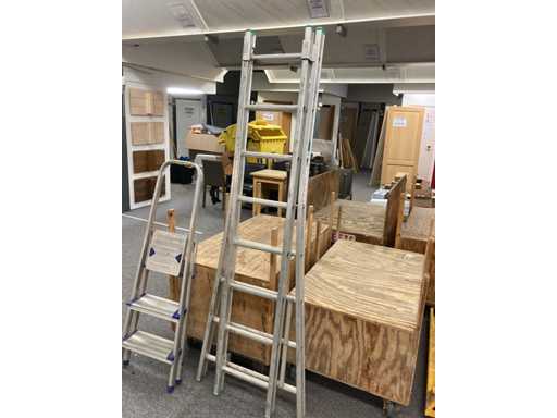 Partij magazijnmateriaal : 5 houten dozen op wielen, 1 transpalet, 2 carren, 1 steekwagen en 1 panneelwagen + 2 ladders