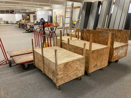 TRanspalet, carren, steekwagen, panneelwagen, ladders en houten kisten op wielen