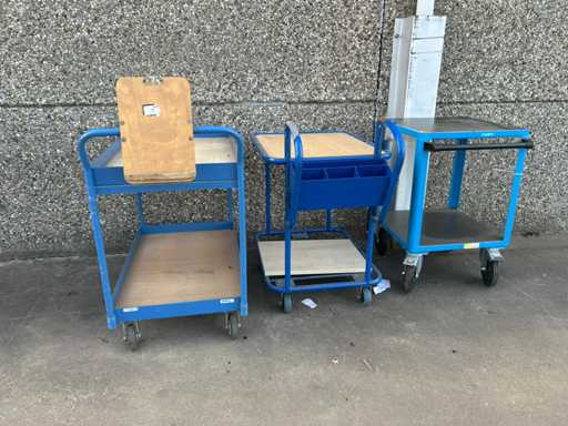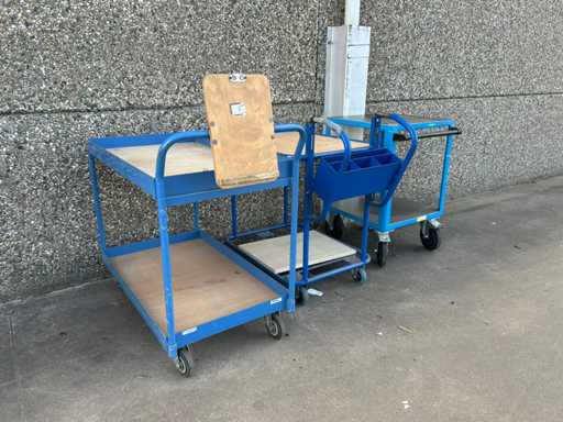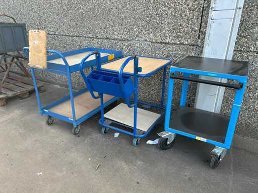 Lot bestaande uit drie stevige, industriële werk- en transportwagens in metalen uitvoering. Geschikt voor magazijn, atelier, werkplaats of logistieke omgeving. Verschillende types met houten of metalen legborden en duwbeugels.