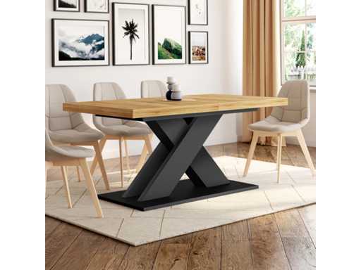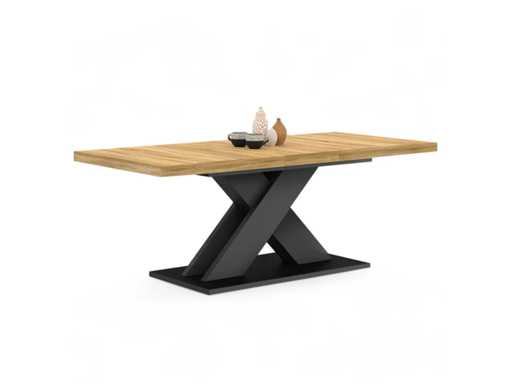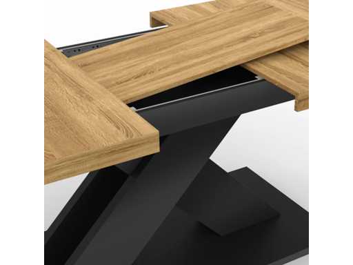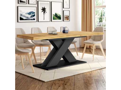 Kenmerken Totale afmetingen: (L) 160/200 x (B) 90 x (H) 75cm Verlenging: 40 cm Totale hoogte van het blad: 6cm Afmetingen voet: (L) 120 x (B) 60 x (H) 3cm Afmetingen van de dunne poten: (L) 20 x (B) 4cm Afmetingen dikke standaard: (L) 20 x (B) 15cm Materialen: 1,5 cm dikke melamine houten deeltjespanelen Kleur: hout en zwart Zelf in elkaar zetten: ja 6 tot 10 personen