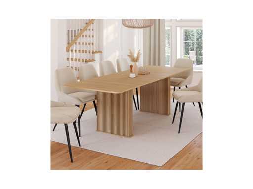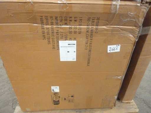 Technische beschrijving Totale afmetingen: (L) 160-240 x (W) 90 x (H) 75 cm Uitbreiding (x2): 40 cm Totale hoogte van de bovenkant: 1,8 cm Basisafmetingen: (L) 12 x (B) 57 cm Standaardafmetingen: (L) 10 x (W) 55 cm Materialen: 15/18 mm MDF Kleur: hout Stel jezelf bij elkaar: ja Biedt plaats aan maximaal 10 personen