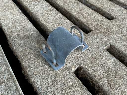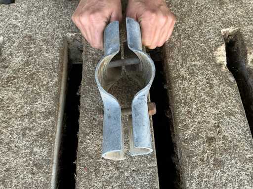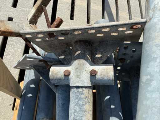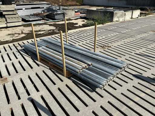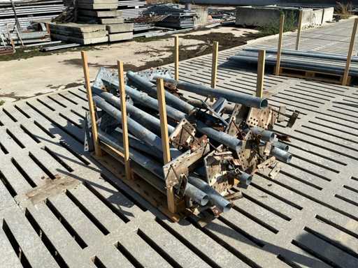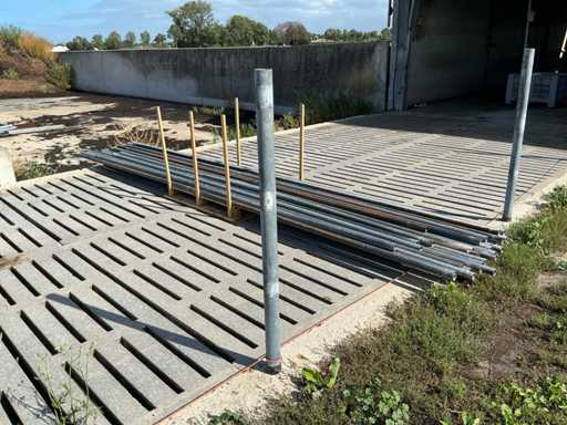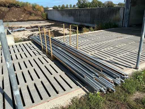 Bestaat uit: 20 poten op schetsplaat 1500mm hoog, 20 buizen Ø60mm 3000mm lang, 6 stuks Ø60 1500mm lang, 24 stuks Ø50mm 6000mm lang, 5 stuks Ø50mm 5000mm lang, reeds gedemonteerd, incl. alle beugels. Palen aan linkerzijde op 1e foto vervallen, deze zijn niet demontabel.
