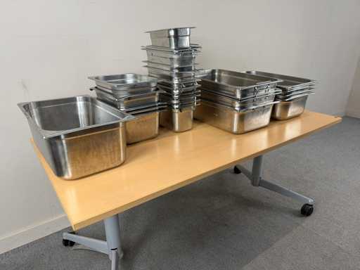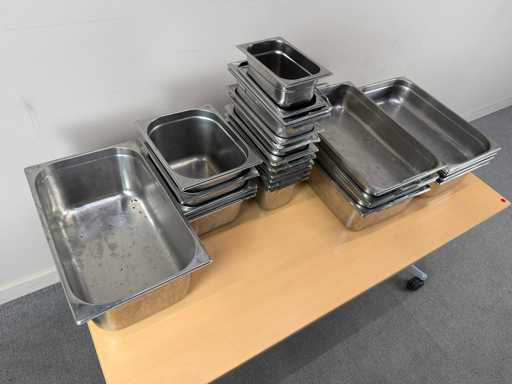 Partij professionele gastronorm bakken in roestvrij staal. Geschikt voor horeca, grootkeuken, catering of voedingsverwerking. Ideaal voor bereiden, bewaren, uitlekken en presenteren van voedingsmiddelen.
