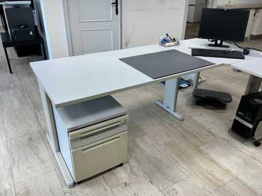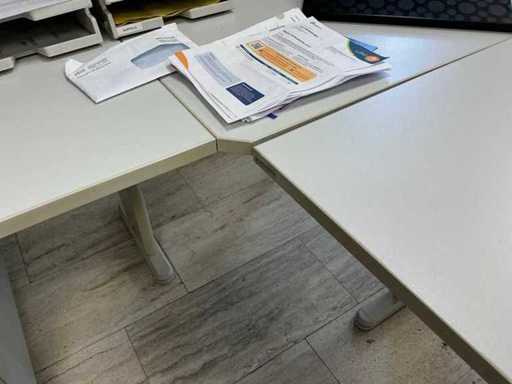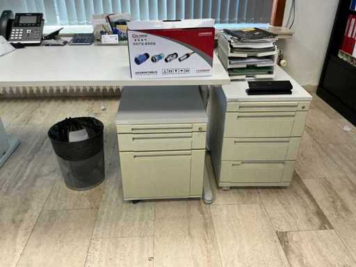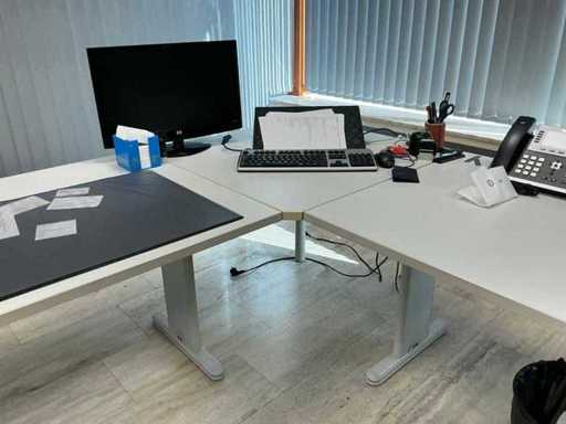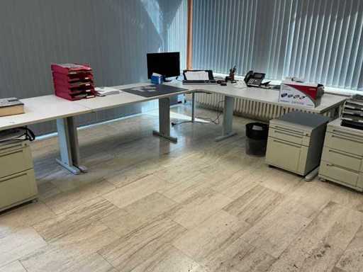 Waaronder 2x voorzien van extra aanbouwtafel met afmeting: 100x60x75cm, compleet met 7 diverse 3 en 4 schuifsladeblokken, enig kantoormateriaal en 3 diverse monitors HP voorzien van toetsenbord en muis (zonder desktops)
