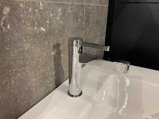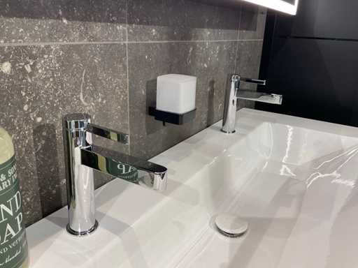 badmeubel met 4 laden; 2 HansGrohe wastafelmengkranen; beker- en handdoekhouder; LET OP: door koper zelf ter plaatse nog te demonteren; zonder de getoonde accessoires
