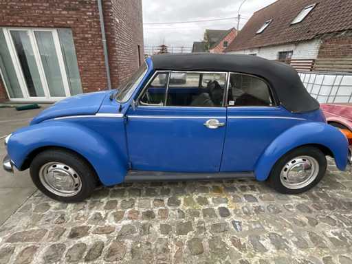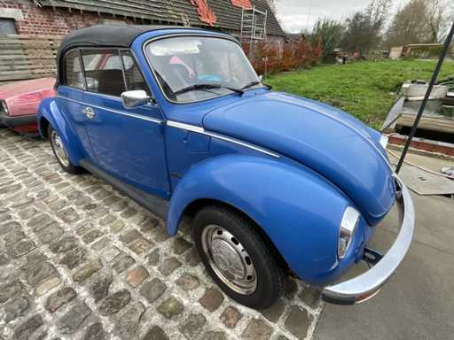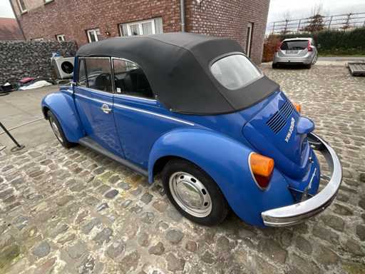 Volkswagen Kever 1303 Cabriolet van Belgische oorsprong, Karmann-model, uitgerust met de 1600 cc motor. Het is een authentieke cabriolet uit 1977, herkenbaar aan het specifieke dashboard, de koepelvormige voorruit en de brede achterlichten. De auto is compleet, rijdt en is uitgerust met een softtop in goede visuele staat.