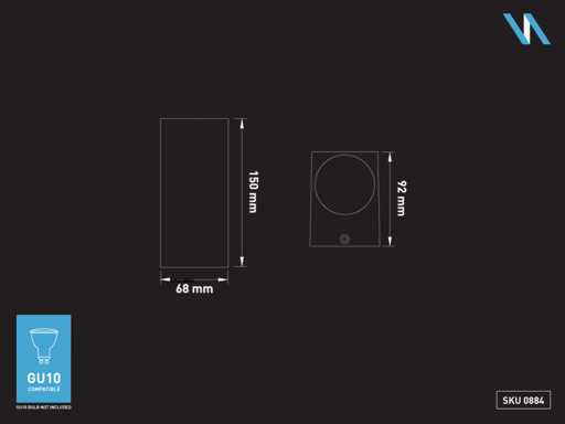 IP44 afdichting, afm. 92 x 68 x 150 mm, materiaal aluminum en glas diffuser, bevestiging inclusief, GU10 fitting, bulb niet inbegrepen, geschikt voor binnen en buiten, 2 x bulb invoer, voltage 220-240V, max 2 x 35 watt, SKU 00884