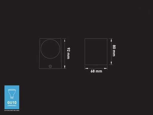 IP44 afdichting, afm. 92 x 68 x 80 mm, materiaal aluminum en glas diffuser, bevestiging inclusief, GU10 fitting, bulb niet inbegrepen, geschikt voor binnen en buiten, een bulb invoer, voltage 220-240V, max 35 watt, SKU 703