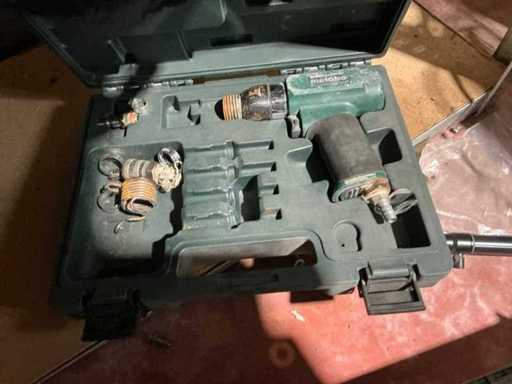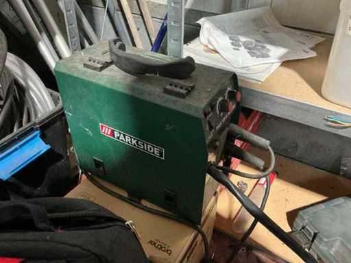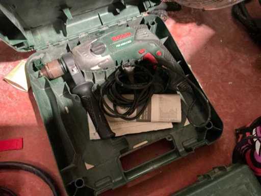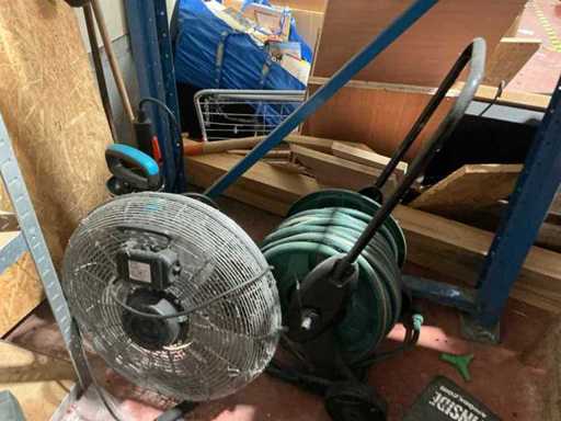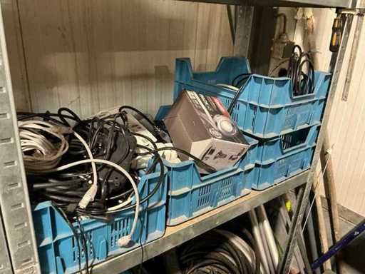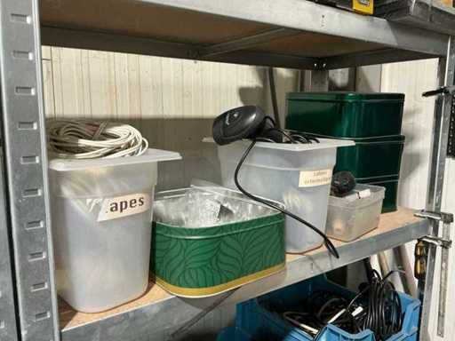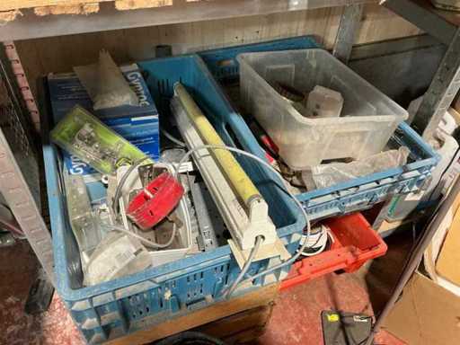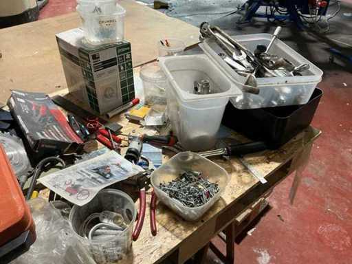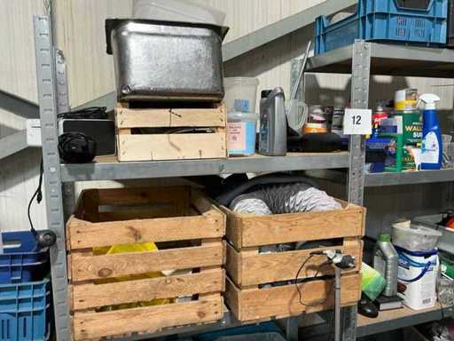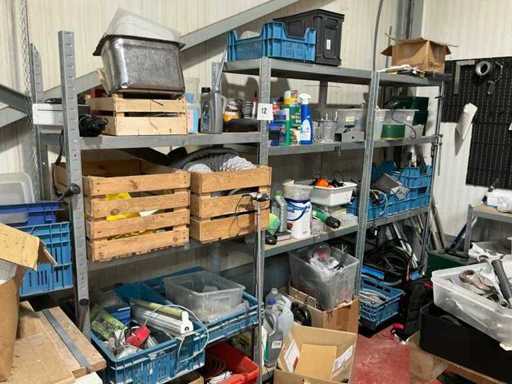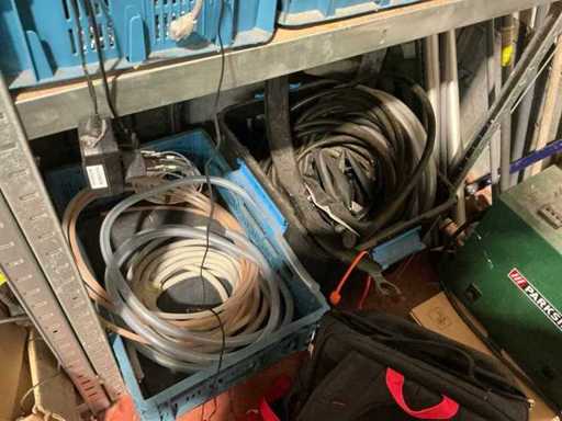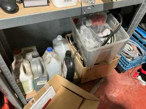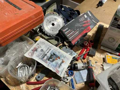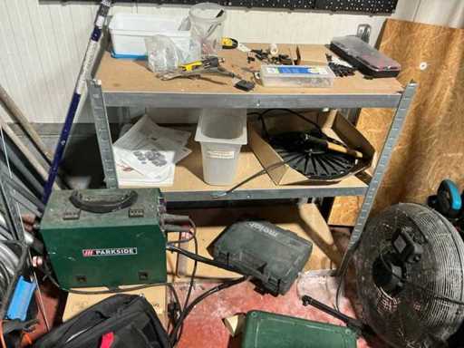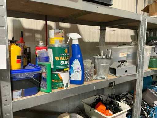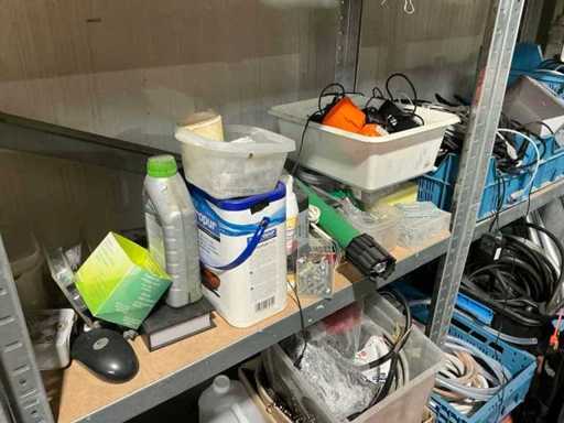 Inhoudende diverse bekabeling, enige verf en lijmtoebehoren, enig deurbeslag, lasapparaat Parkside, 2 diverse boorschroefmachines Bosch waaronder PSB750-2RE en PSB 1000-2 RE, Waterslanghaspel, drukspuit, pneumatisch nietjespistool Paslode, enig handgereedschap, pneumatische slagmoersleutel Metabo