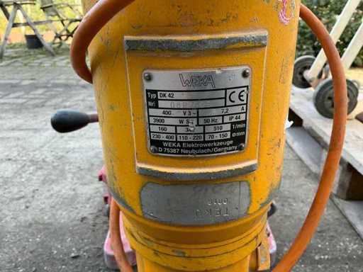 Voorzien van: WEKA DK 42 is een professionele diamant kernboormotor op 400 V (3-fase) met ca. 3900 W vermogen, 7,2 A, 50 Hz, IP44 bescherming en variabele toerentallen rond 160–510 rpm geschikt voor boorbereiken van circa 70–150 mm.