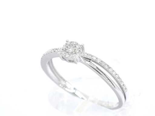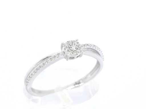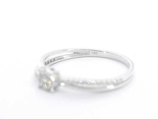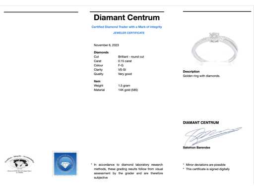 Diamant: Natuurlijk; Slijpvorm: Briljant en rond geslepen; Gewicht (carat): 0.15 carat; Kleur: F-G; Zuiverheid: VS-SI; Slijpkwaliteit: Zeer mooi; Juweel: Ring; Gewicht: 1.5 gram; Ringmaat (op maat gemaakt*): 53 (17 mm); Materiaal: 14 karaat (585); Conditie: Nieuw; Verpakking: Luxe sieradendoos; Toelichting: De kwaliteit is overgenomen van het rapport behorend bij item. De waardebepaling is een beoordeling van een gecertificeerde diamantair, gebaseerd op consumentenprijzen.; Consumentenprijs: € 1.208,-